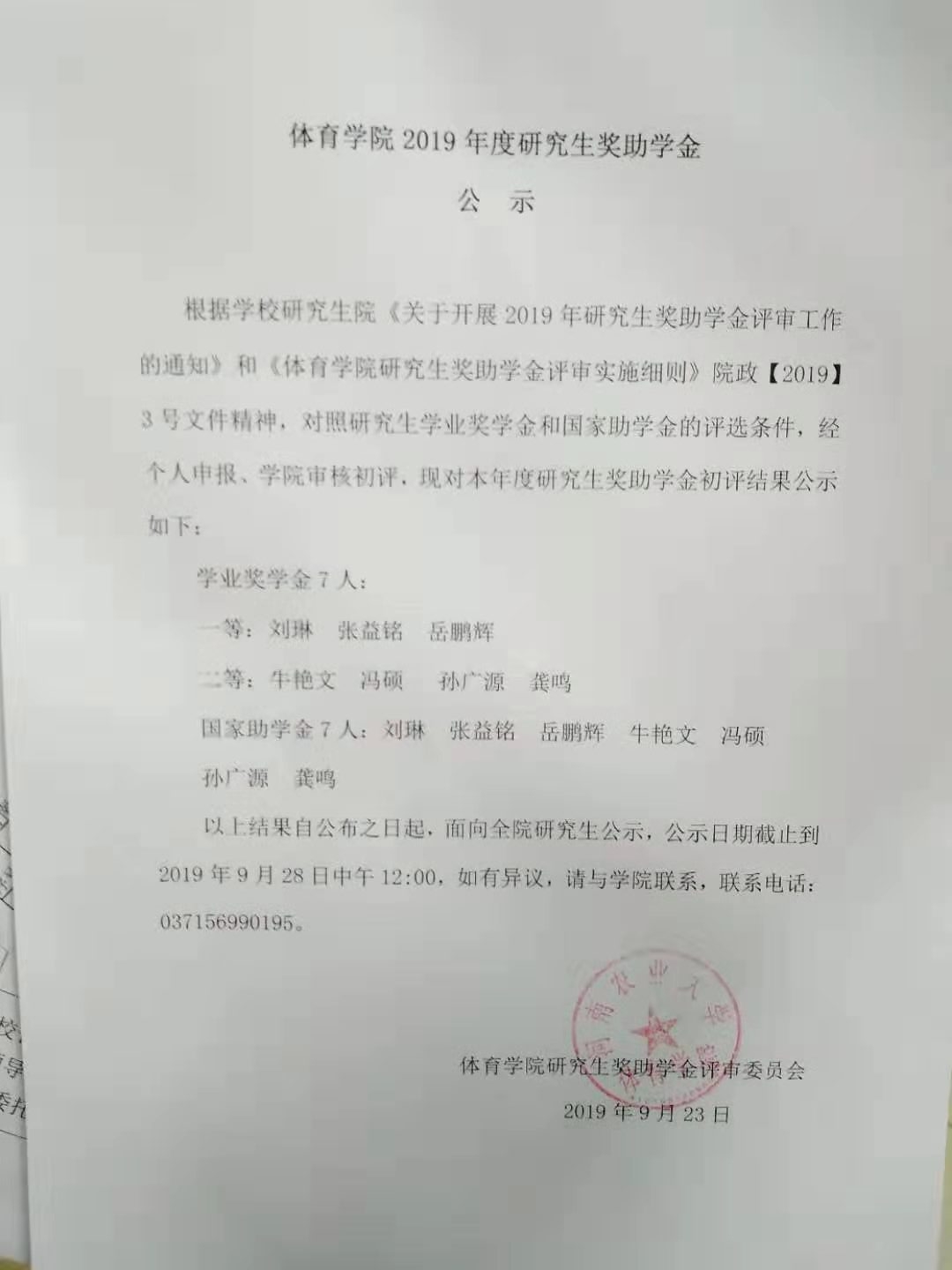根据学校研究生院《关于开展2019年研究生奖助学金评审工作的通知》和《立博官网 研究生奖助学金评审实施细则》院政【2019】3号文件精神,对照研究生学业奖学金和国家助学金的评选条件,经个人申报、立博 审核初评,现对本年度研究生奖助学金初评结果公示如下: