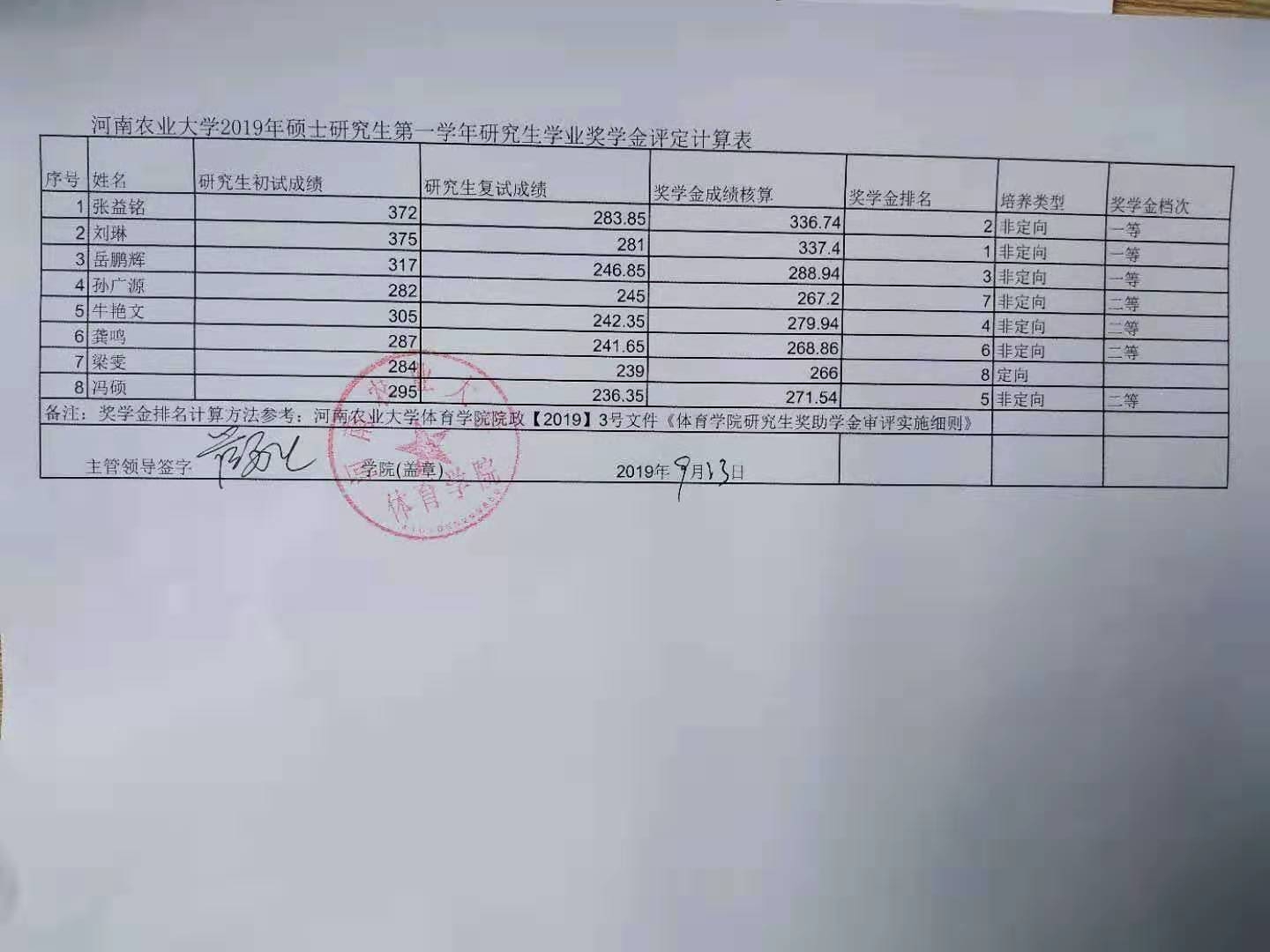 河南农业大学2019年硕士研究生第一学年研究生学业奖学金评定计算表