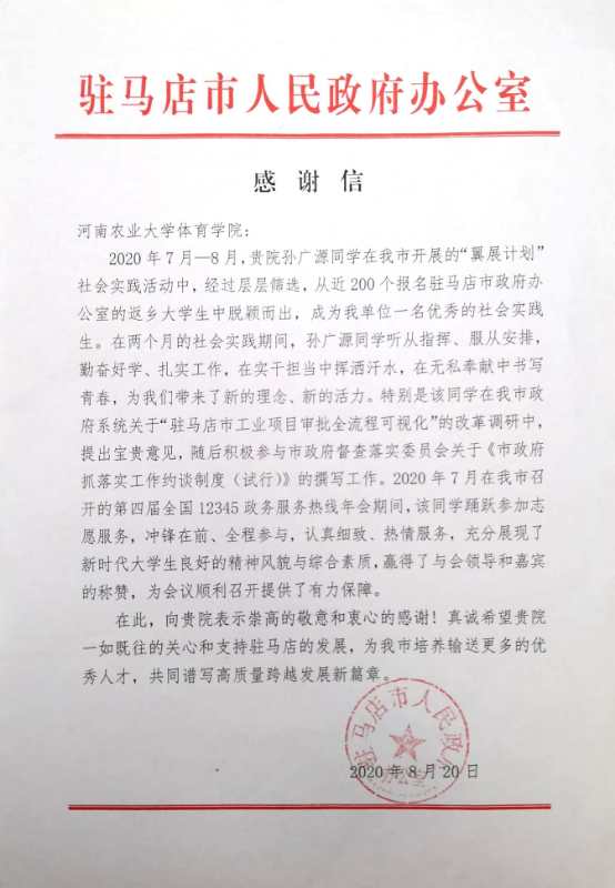 8月20日,驻马店市政府办公室给立博 发来感谢信,对立博(中国)唯一官方网站 培养优秀人才表示感谢。