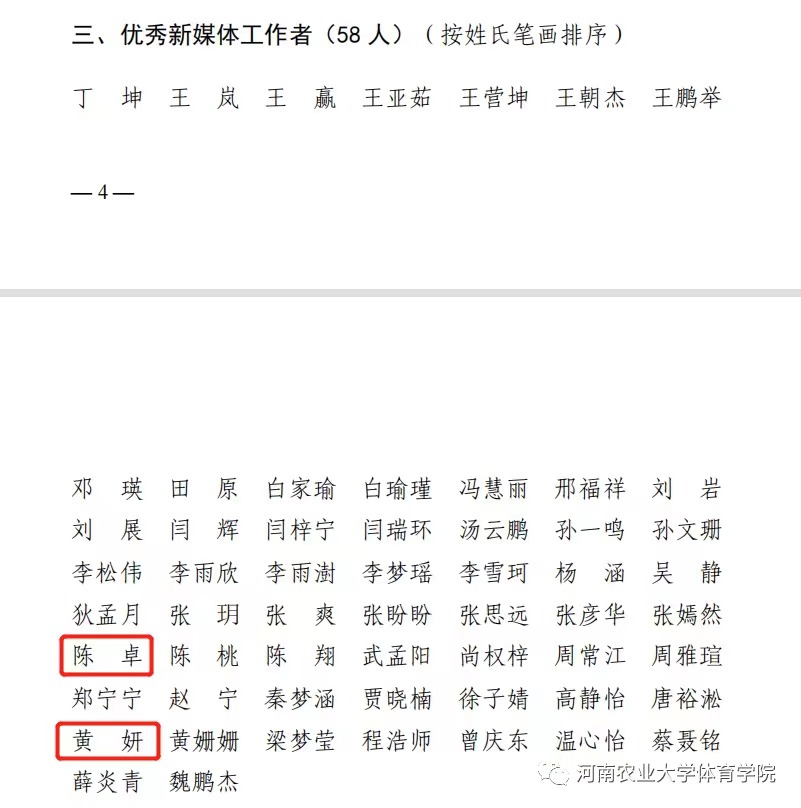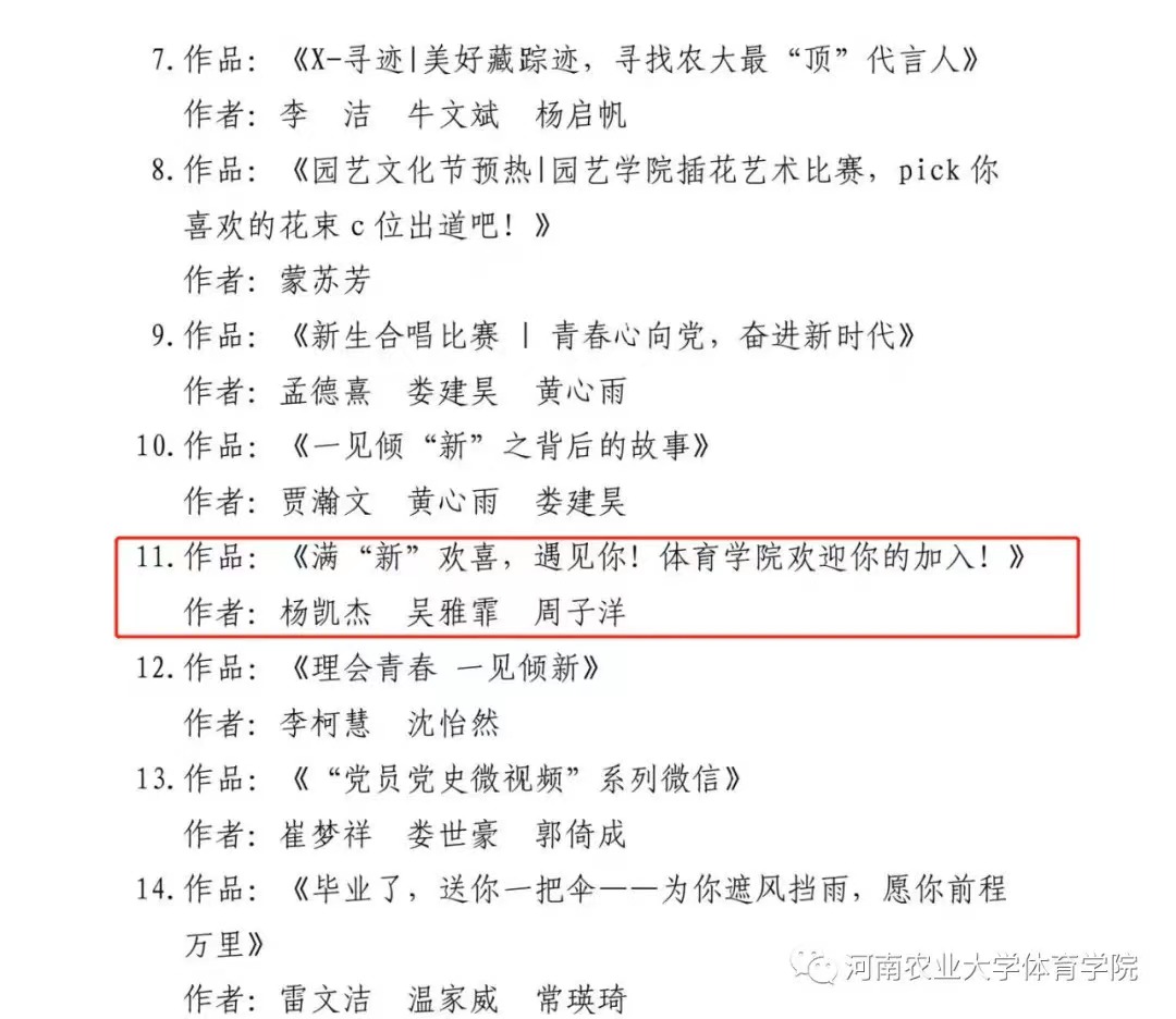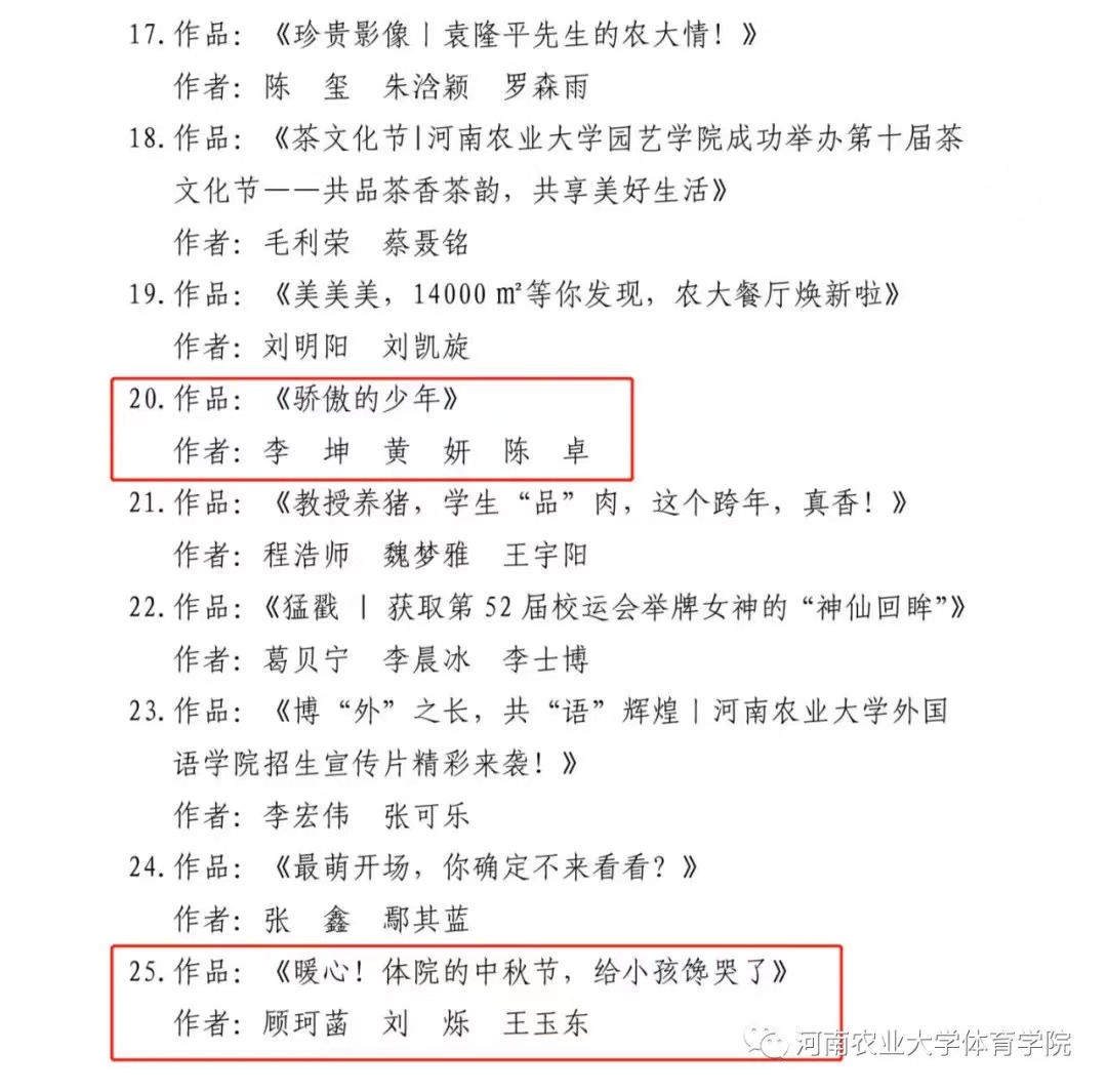 近日,我校发布《关于表彰2020—2021年度河南农业大学十佳新媒体平台、十佳短视频、优秀新媒体工作者、优秀新媒体作品的决定文件》(校党宣【2021】12号)。立博(中国)唯一官方网站 新媒体作品《骄傲的少年》、《暖心!体院的中秋节,给小孩馋哭了》荣获一等奖;作品《满“新”欢喜,遇见你!立博官网 欢迎你的加入!》荣获三等奖;院团委书记黄妍、院新媒体主任陈卓荣获“优秀新媒体工作者”的荣誉称号。
