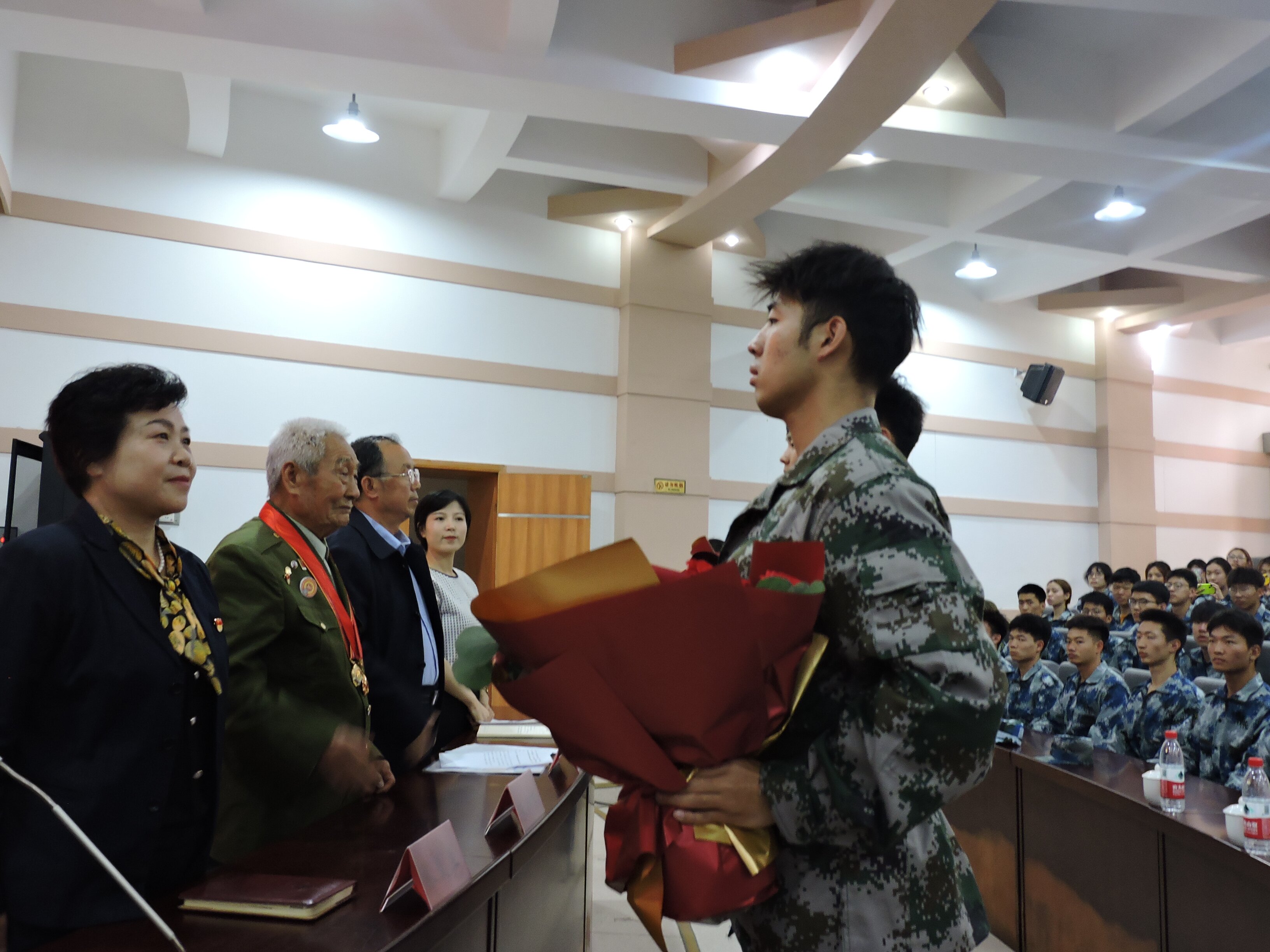 活动在《中国人民志愿军战歌》的齐声合唱中拉开序幕,郑州老战士之家创办人、口述战争历史博物馆馆长、宣讲团团长张爱兰首先作宣讲,她介绍了老战士之家创建历程和“三团一馆一队”红色基因传承情况,畅谈了十五年如一日发挥红色资源优势,开展爱国主义的感受和体会,勉励大学生发扬特级英雄杨根思“三个不相信”精神,战胜学习生活中的各种困难,砥砺青春无畏前行,为实现中华民族伟大复兴贡献智慧和力量。活动中,立博(中国)唯一官方网站 军训教官代表向宣传团成员及抗美援朝战士献上鲜花,致敬老一辈英雄对国家做出的贡献。