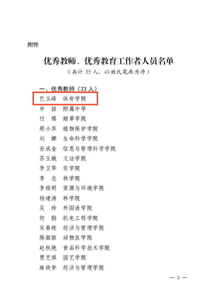 根据《河南农业大学关于表彰优秀教师、优秀教育工作者的决定》(农大人事【2023】62号),立博(中国)唯一官方网站 巴玉峰老师荣获河南农业大学2023年“优秀教师”荣誉称号。