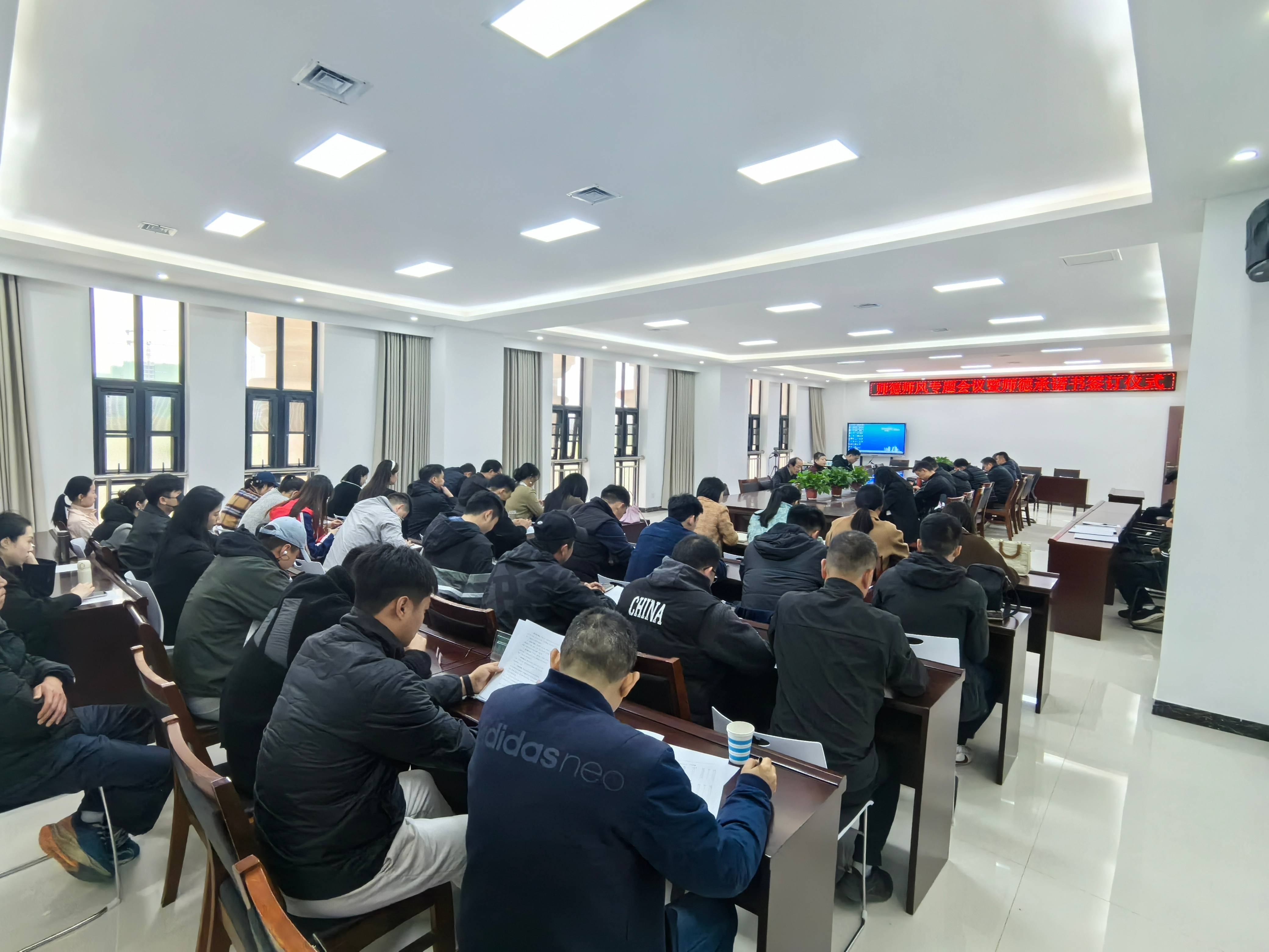 会议室召开了师德师风专题会议暨师德承诺书签订仪式。立博
