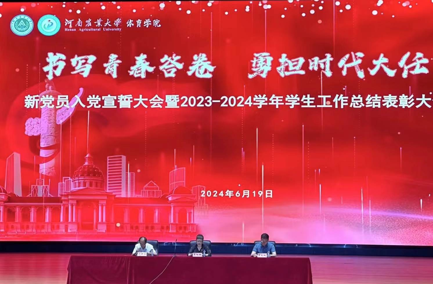 于龙子湖校区英林大讲堂大礼堂举办以“书写青春答卷 勇担时代大任”为主题的新党员入党宣誓大会暨2023-2024学年学生工作表彰大会。立博