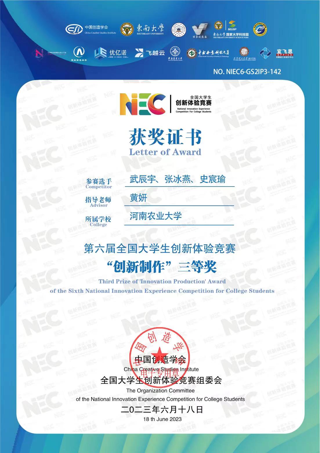 在中国创造学会的指导下,由东南大学和安徽工业大学联合承办, 南京江宁经济技术开发区协办,东南大学国家大学科技园、安徽工业大学创新教育立博 组织实施的第六届 “全国大学生创新体验竞赛” 于2023年6月18日顺利结束,共有来自330所高校的2626组选手报名参赛。立博(中国)唯一官方网站 两件学生创新作品在本次竞赛中取得三等奖。
